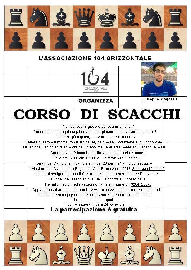 L'associazione 104 Orizzontale è lieta di presentarvi il 1° Corso di scacchi organizzato in collaborazione con il Campione Provinciale under 20 per il 2° anno consecutivo e vincitore del Campionato Regionale Cat. Promozione 2013 Giuseppe Magazzù.