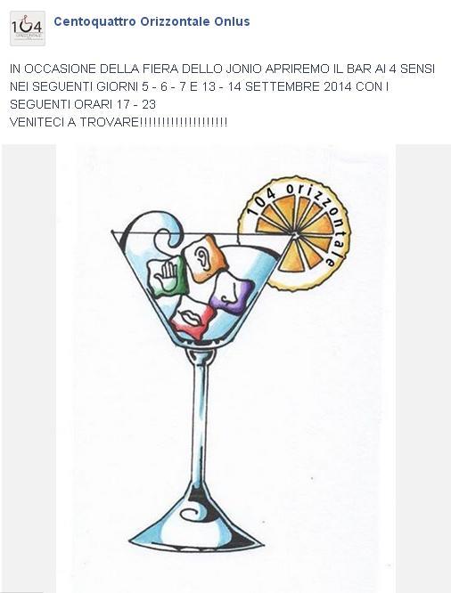 IN OCCASIONE DELLA FIERA DELLO JONIO APRIREMO IL BAR AI 4 SENSI NEI SEGUENTI GIORNI 5 - 6 - 7 E 13 - 14 SETTEMBRE 2014 CON I SEGUENTI ORARI 17 - 23