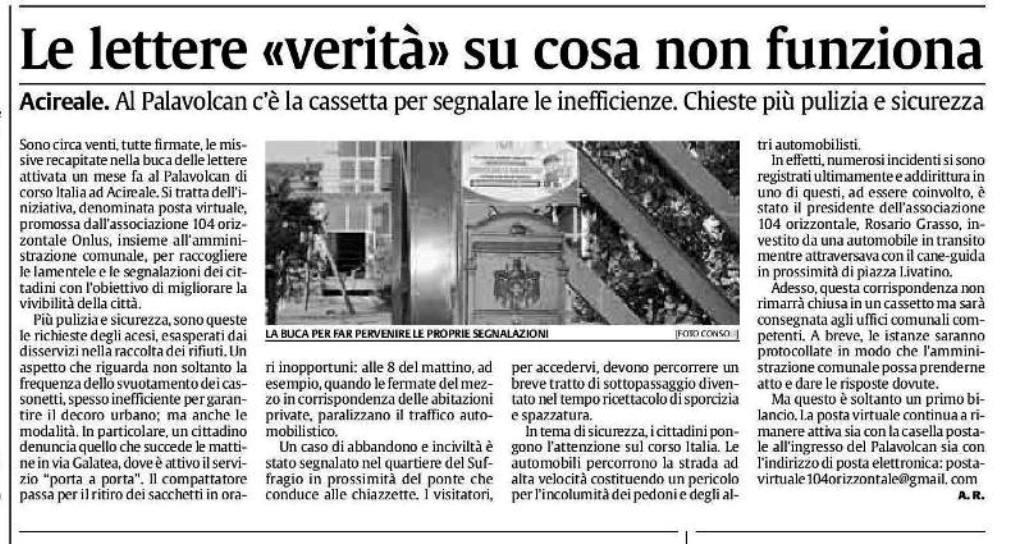 Ottiene successo l'iniziativa denominata postavirtuale104orizzontale@gmail.com che fa registrare la ricezione delle prime lettere di segnalazione su cosa " non funziona ". Sono infatti circa venti, tutte firmate, le missive recapitate nella buca delle lettere attivata un mese fa al PalaVolcan.